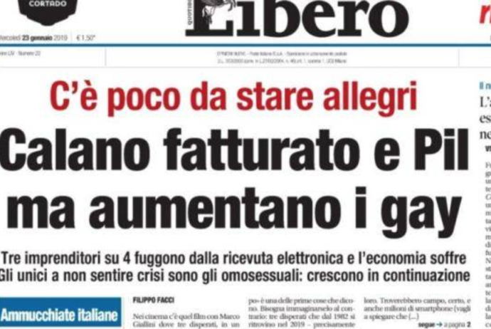 Con gli omosessuali per esempio, per dirla con Libero di Feltri: " Calano fatturato e Pil ma aumentano i gay". Con tanto di sommario: "C’è poco da stare allegri", e di spiegazione: " L’economia soffre, ma gli unici a non sentire crisi sono gli omosessuali: crescono in continuazione". Qual è lo scopo? Provocare invidia o indignazione? L’odio contro il diverso, spesso celato dietro l’ipocrita gentilezza di un linguaggio garbato, affonda i suoi artigli nella scrittura di chi non ti sorprende che sia fascista, ma che possa farlo con i soldi dello Stato. A questo governo non piacciono i titoli e la scrittura di Repubblica, del nostro giornale, solo perché la pensa spesso diversamente, perché lascia spazio di pensiero pensato, ma non si indigna per quelle testate come Libero che in prima pagina fanno della volgarità dell’offesa al diverso il proprio vangelo. Mercoledì scorso, dopo aver demonizzato i terroni al governo, dopo la volgarità di un’aggressione continua a chi cerca aria di sopravvivenza sulle nostre sponde, Libero apre la caccia all’omosessuale.